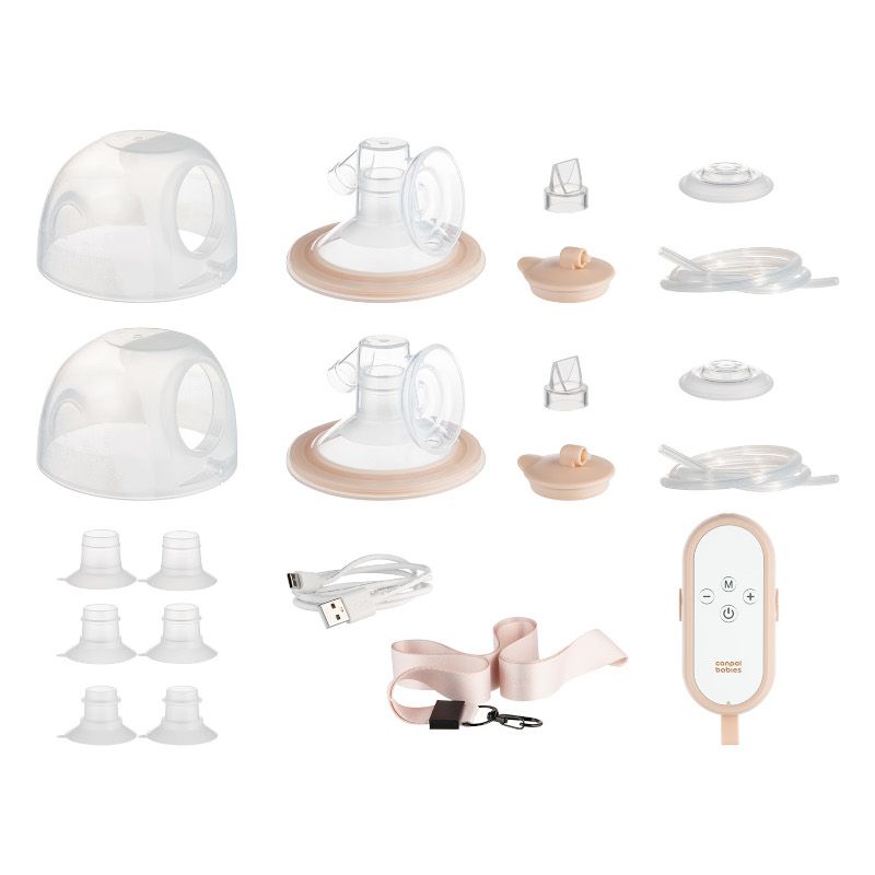 Комплектът включва: захранващ кабел - type C, устройство за управление/мотор на помпата за кърма, силиконова мембрана 2 бр., антивъзвратен клапан 2 бр., фуния 27 мм 2 бр., чашка/контейнер за кърма 2 бр., мембранен капак 2 бр., силиконов маркуч 2 бр., силиконови редуктори на фунията 6 бр. (3 различни размера: 19 мм, 21 мм и 24 мм), лента за закачане 2 бр., удължител за презрамка за сутиен 2 бр.