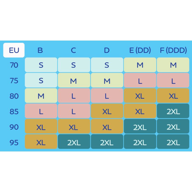 - Сутиенът е с широки презрамки - удобни и функционални, дори за по-големи гърди. Допълнителен удължител в задната част и регулируемо закопчаване с кукички осигуряват перфектно прилягане за всеки размер бюст и чашка. Можем да ви предложим 5 размера, от които да изберете подходящия за вас.