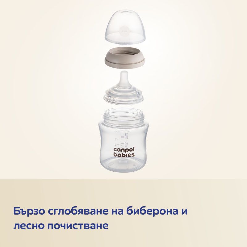 Шишето се предлага в три функционални вместимости: 150 мл, 260 мл и 330 мл. То е леко, удобно и лесно за почистване – препоръчваме използването на Canpol babies Ecological препарат за почистване на шишета и биберони.