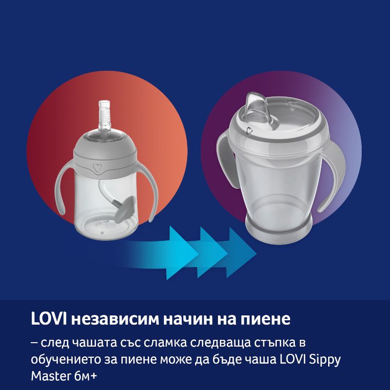 - След чашата със сламка, следващата стъпка в обучението за самостоятелно пиене може да бъде неразливащата се чаша LOVI Sippy Master 6м+.