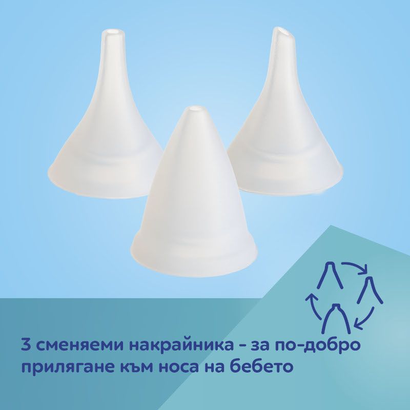- Разполага с 3 сменяеми накрайника, за да се адаптира по-добре към носа на детето и ефективно да почисти секретите, позволявайки спокойно дишане.