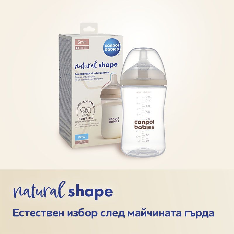 Специализираното антиколик шише Canpol babies Natural Shape е предназначено за новородени и кърмачета и е естествен избор след кърменето. То е разработено в сътрудничество с логопед , за да отговори на нуждите на родители, които редуват кърменето с храненето от шише. Едно от най-големите притеснения на родителите е отказът от кърмене при редуването му с хранене от шише.