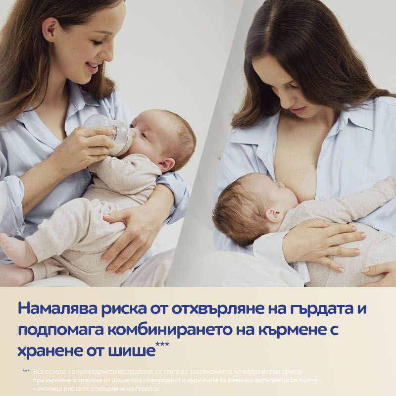 Проучване от логопед на шишето Natural Shape с двузонов биберон при кърмачета* показа, че то се приема бързо от кърмените бебета още от първото хранене. Намалява риска от отказ от кърмене и поддържа алтернативното хранене***.