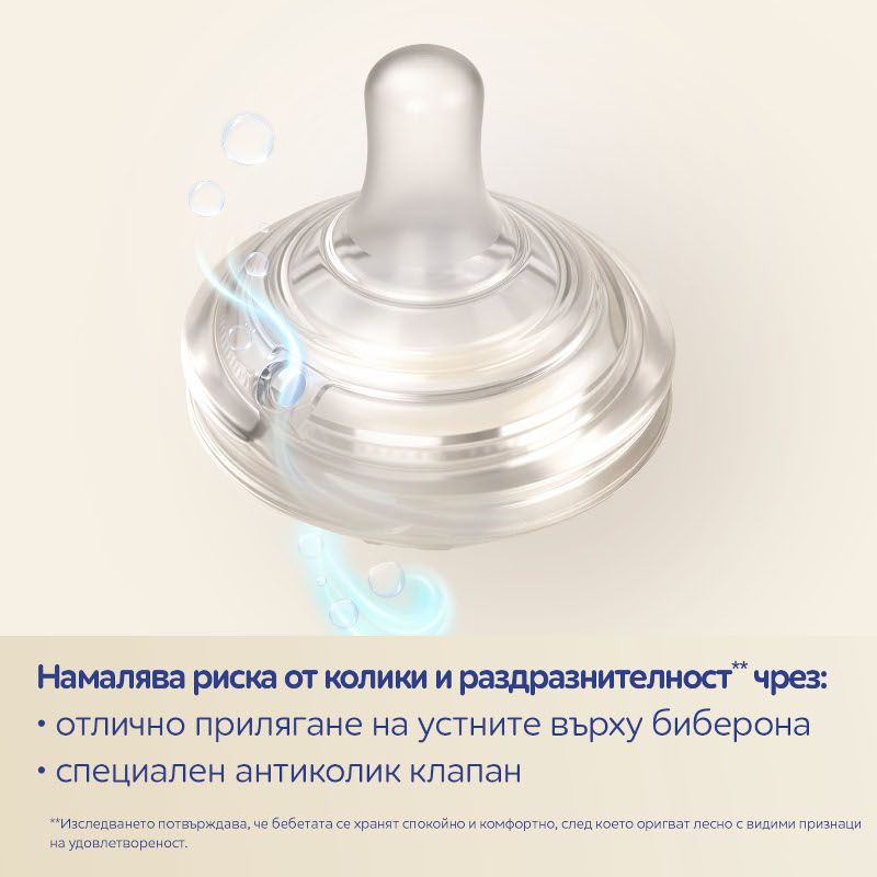 Шишето е с иновативен двузонов биберон с технология DuoFlex, който следва естествения ритъм на сучене на бебето. Гъвкавият връх имитира естественото движение на зърното на майката по време на сучене. Стабилната основа наподобява формата на гърдата и позволява естествено, широко позициониране на устните върху биберона и плавно сучене, без паузи или поглъщане на въздух, намалявайки риска от колики и раздразнителност**.